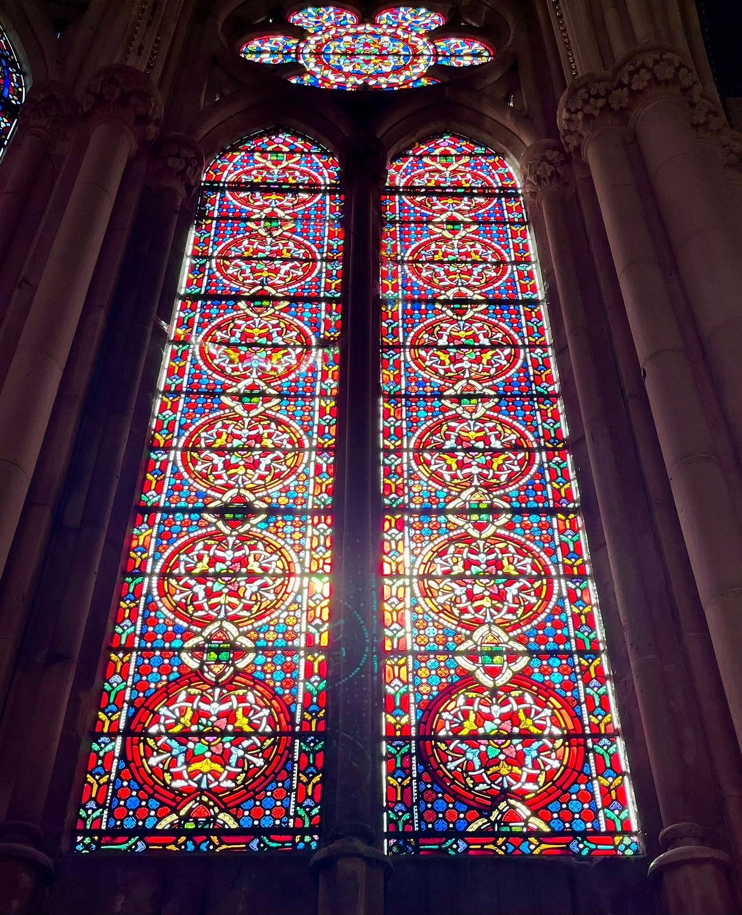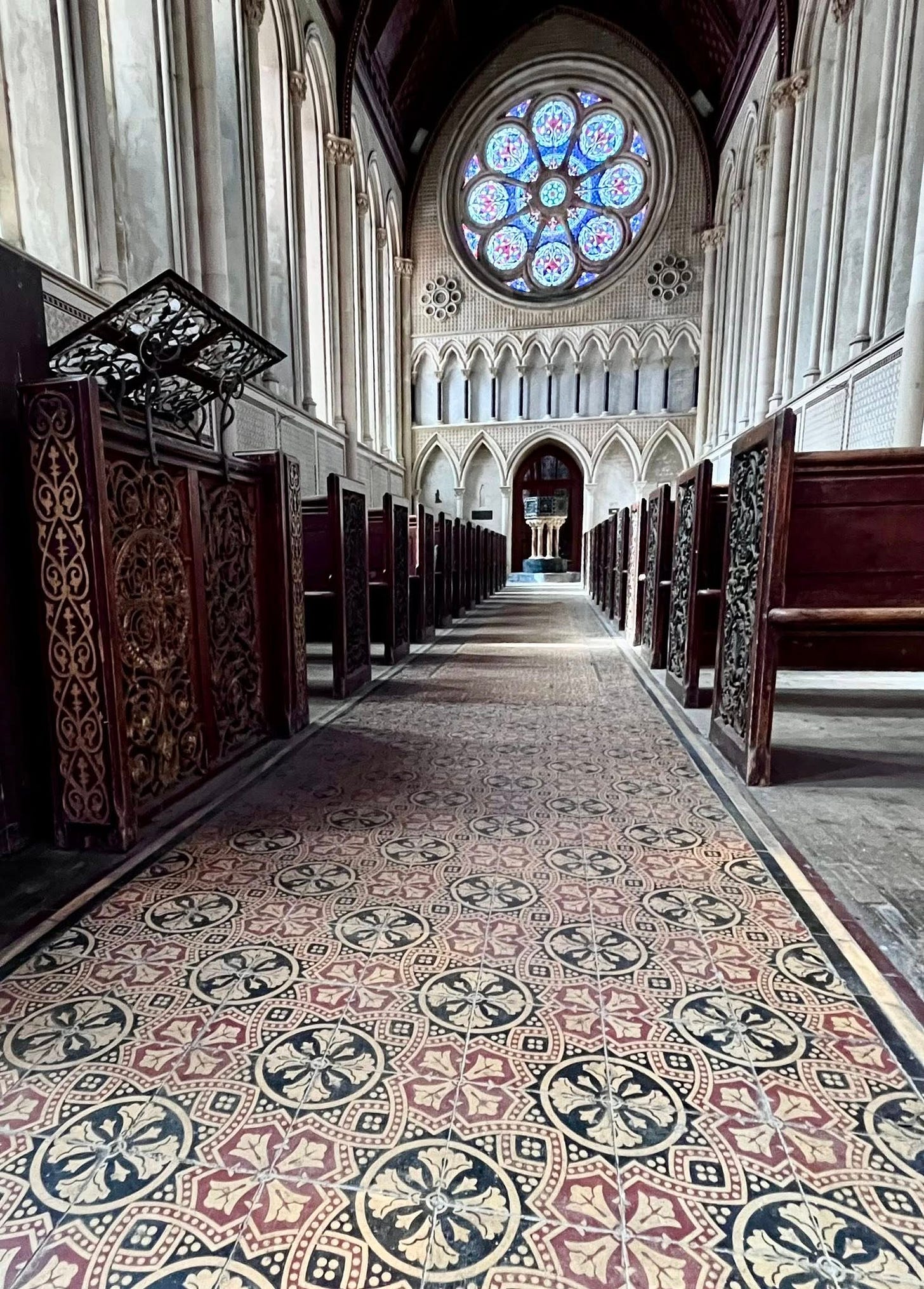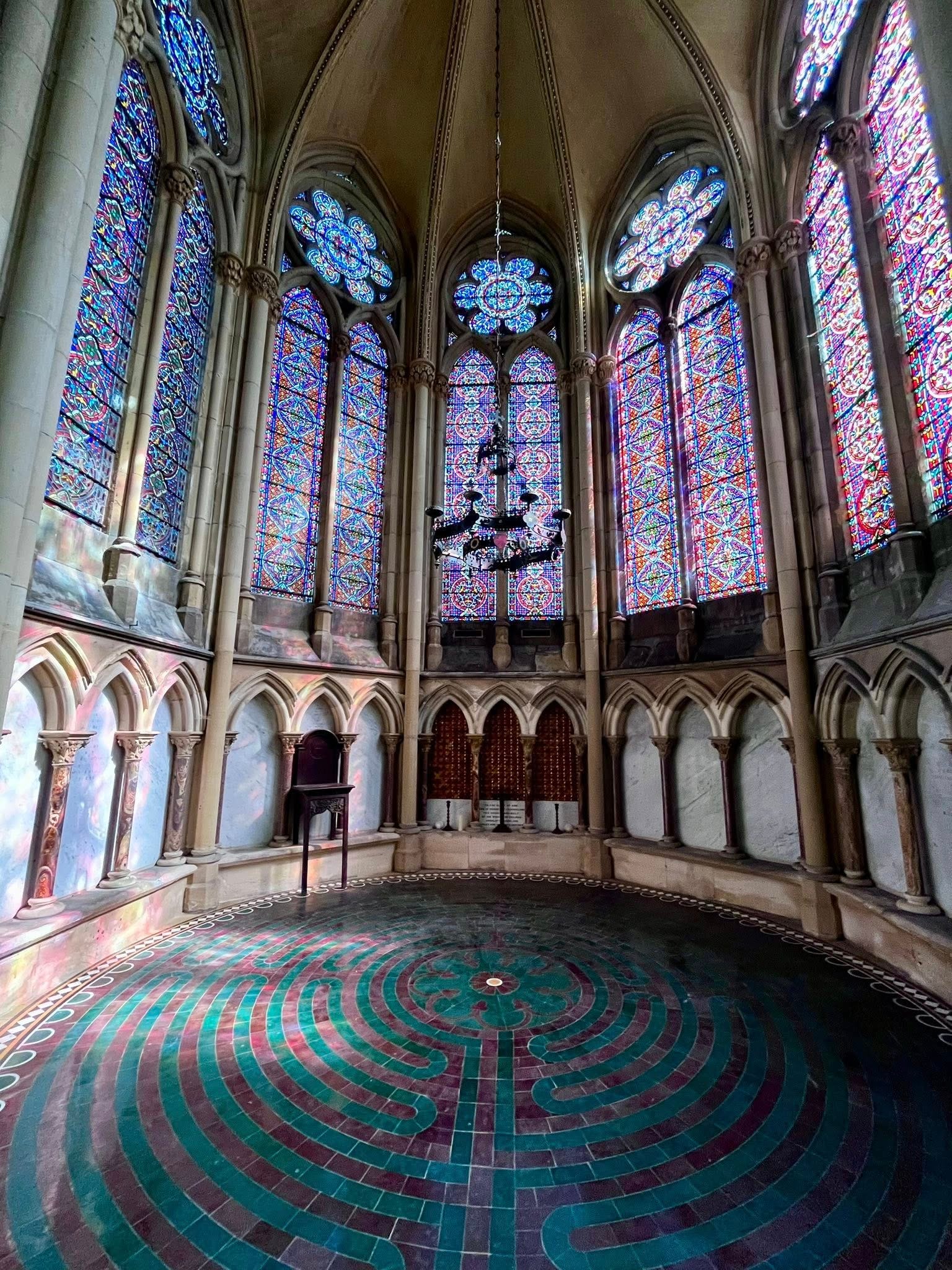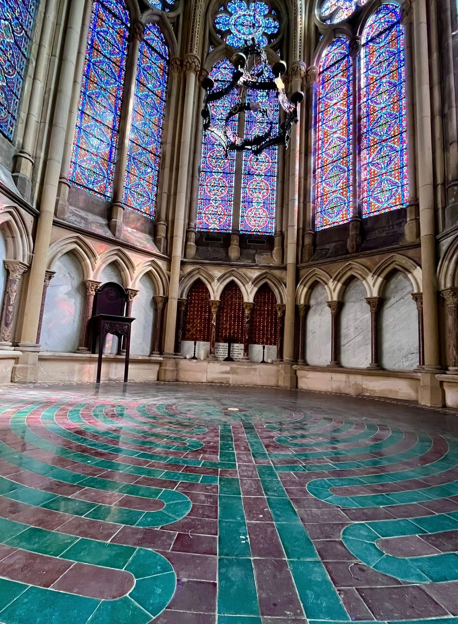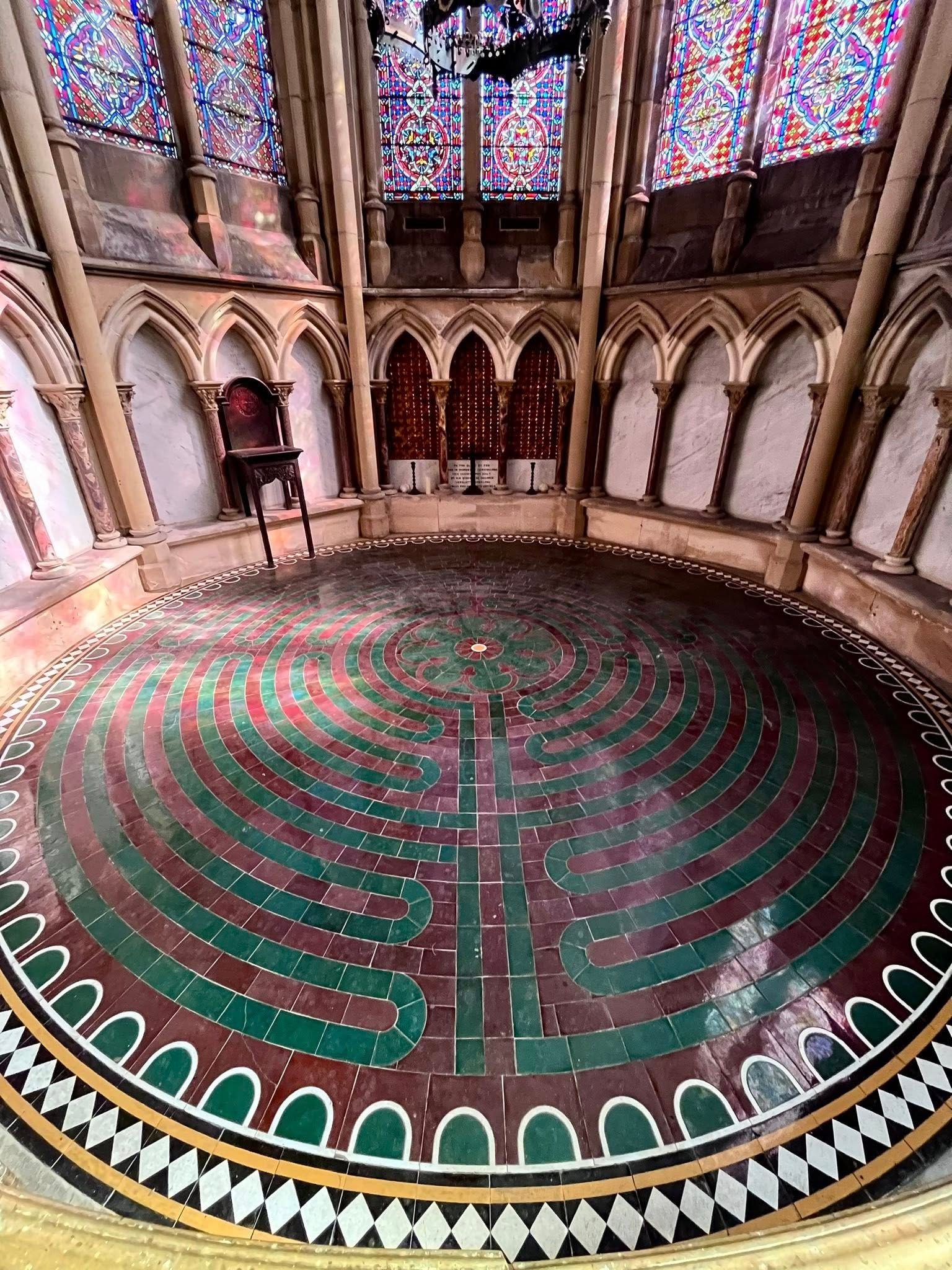The labyrinth at St Mary’s is a direct copy of the Chartres one, although on a smaller scale. The church was built in 1866, so is fairly modern in church terms, and includes beautiful stained glass windows which surround you, bathing you in ethereal colours, as you take your steps in contemplation.